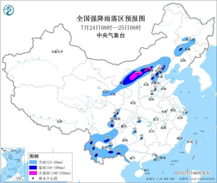 从7月24日的7月24日08:00 7月25日的08:00,预计大雨将大雨N北部和西部中心,中部和北部,北部北部和北部,北部北部,北部北部和北部以北,西南部,西南,东部的标准区域,华氏东部和东部的中心,中心,中心和东部地区中部地区,中部地区中部地区,中部地区和中部地区,中部地区和中部地区和中部地区和中部地区和中部地区和中部地区和中部地区和中部地区和中部地区和中部地区和中部地区和中部地区和中部地区和中部地区和中部地区和中部地区和中部地区和中部地区和中部地区和中部地区和中部地区和中部地区和中部地区和中部地区和中部地区和中部地区和中部地区,地区和中央地区。东方云南省,广东西部,东甘舒,东甘肖,中部和西吉林,南南旺和其他地方。其中,大雨(100-180毫米)位于蒙古东南部,东南,西部,北京东北部和四川盆地的西南部。以前的一些地区在短期内伴有大雨。强烈的对流气候,例如风暴和强风(见图1)。中央气象学l天文台继续在7月24日6:00发出大雨的黄色警告。