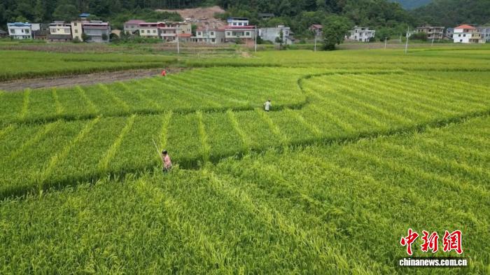 中国新闻服务Qiyang,9月4日(冯齐和陈·辛宁),这是混合水稻授粉的关键时期。在湖南省温敏市萨吉安格村的持续农业中,农民进行了花朵的人工作战。
